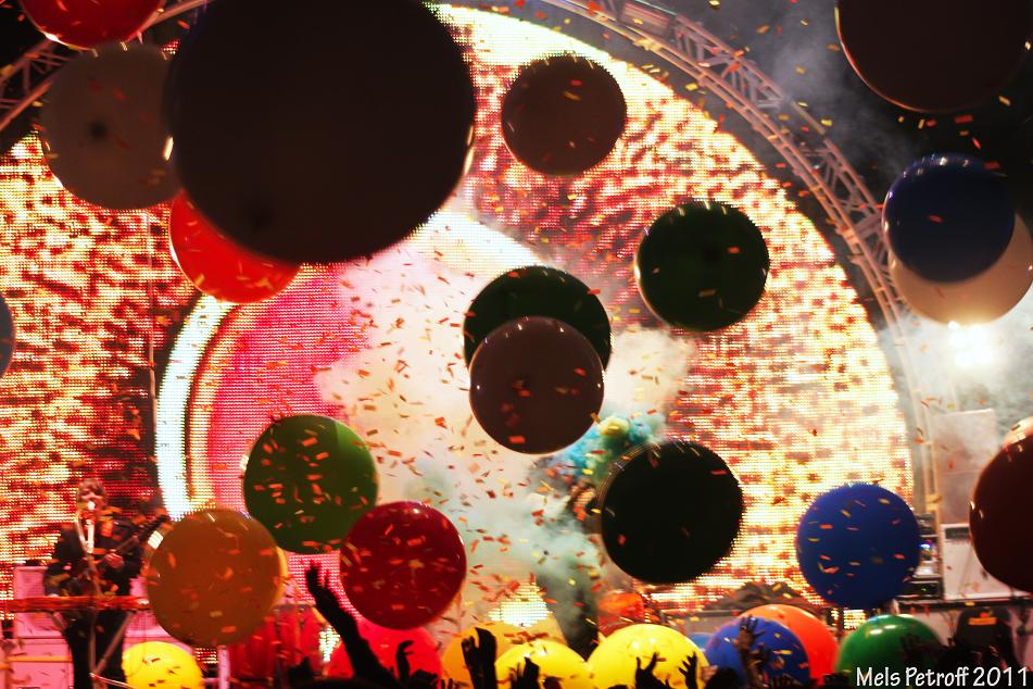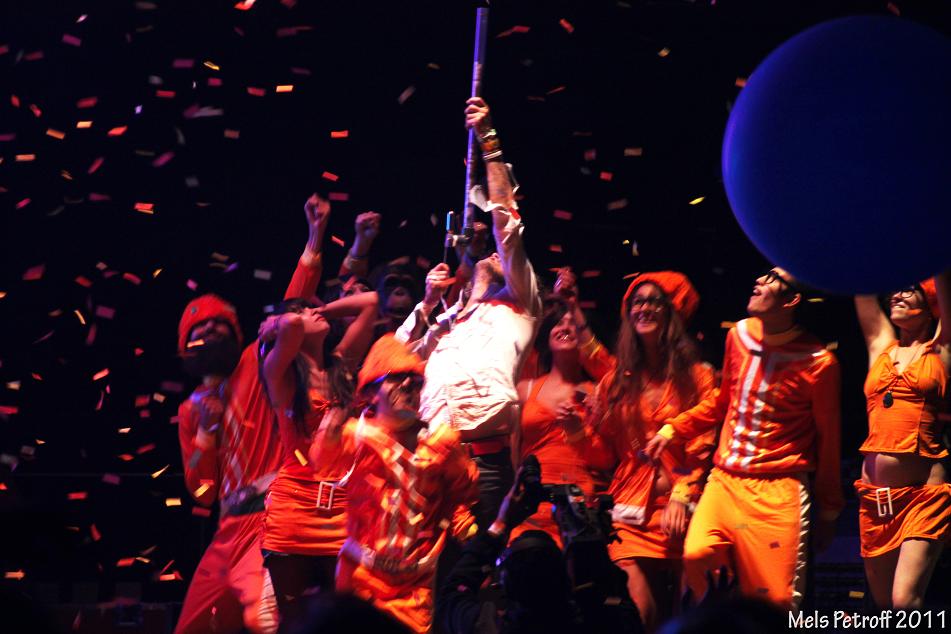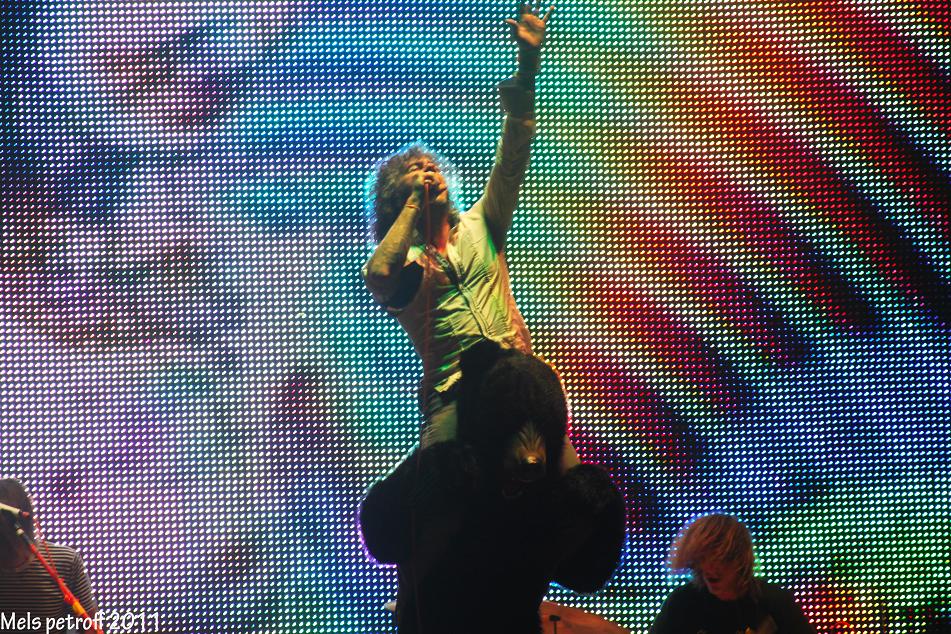 En el escenario podíamos apreciar a la banda y a unos personajes vestidos de naranja en los costados que se bailaban y saltaban todo.Wayne cantando en los hombros de un tipo disfrazado de mono, animales y hombrecitos inflables gigantes, gongs luminosos, muchachas desnudas de colores en la pantalla y también algunos animales, las manos gigantes de Wayne en “Laser Hands”, más serpentinas disparadas por él, infinitas cantidades de papeles de colores, pelotas de colores entre el publico que definitivamente pintaron una noche que ninguno de los que estábamos ahí presentes iba a olvidar.